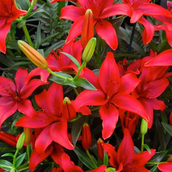 Asiatic lilies are herbaceous flowering plants that have large prominent flowers, Lilium asiaticum is the scientific name of the plant. Bulbous rootstock with central growing point covered by concentric layers of scales. These perennial lily flowers are trumpet-shaped, reflexed, cup-shaped, or bowl-shaped. All lily flowers have six petals and six anthe ¹ Most are sweetly scented