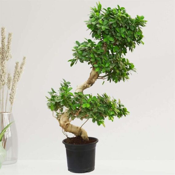 The Ficus S Shape Bonsai thrives indoors in bright, indirect sunlight and prefers well-draining soil. Regular watering is essential to keep the soil consistently moist but not waterlogged. With its graceful silhouette and easy-care requirements, the Ficus S Shape Bonsai is an excellent choice for bonsai enthusiasts and adds a touch of elegance to any indoor space.