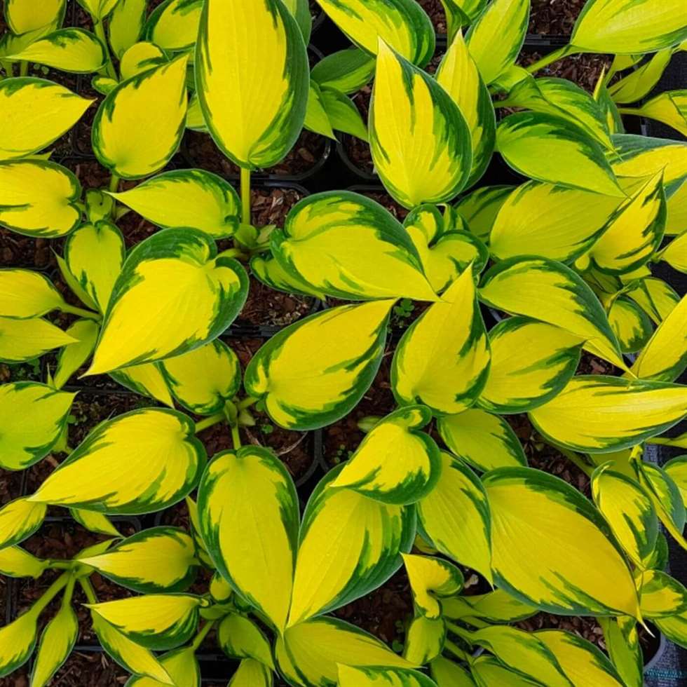 This hosta has leaves that emerge slightly quilted and green but quickly develop a yellow center with a hint of orange and dark green margins. As the season progresses, the centers lighten to an off-white but the dark green margins remain.
