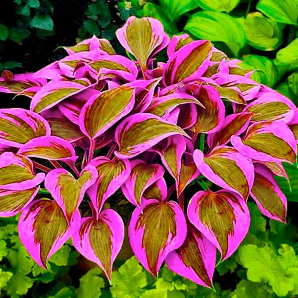 This hosta has leaves that emerge slightly quilted and green but quickly develop a yellow center with a hint of orange and dark green margins. As the season progresses, the centers lighten to an off-white but the dark green margins remain.