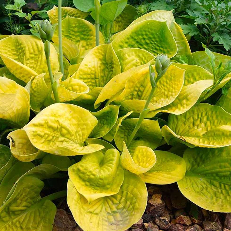 This hosta has leaves that emerge slightly quilted and green but quickly develop a yellow center with a hint of orange and dark green margins. As the season progresses, the centers lighten to an off-white but the dark green margins remain.